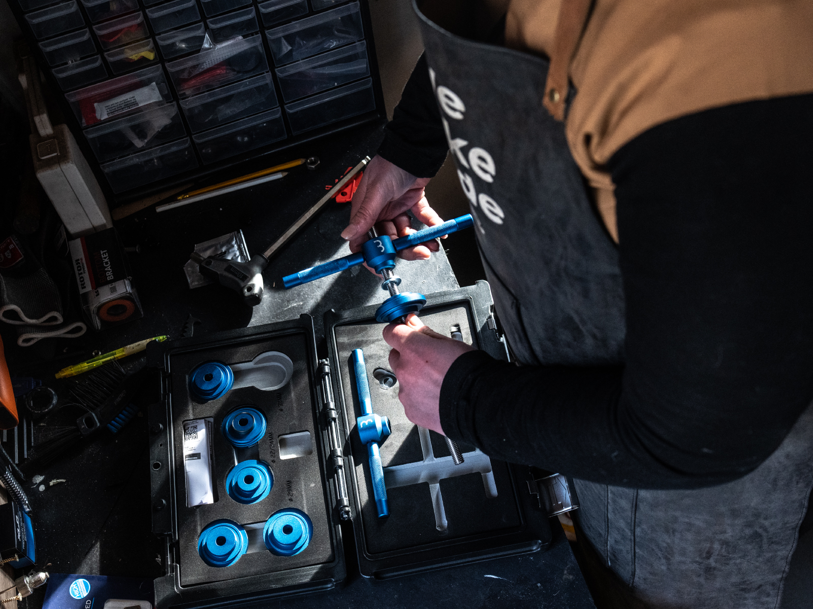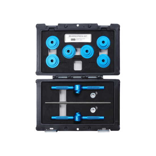 Die präzise Installation von Pressfit-Innenlagerlagern kann nur mit den richtigen Werkzeugen erfolgen. Mit dem BearingPress-Set hast du alle richtigen Werkzeuge dabei. Das BearingPress-Set ist mit allen Pressfit-Lagertypen kompatibel, die BBB Cycling auch liefert. Die CNC-gefrästen Becher ermöglichen es, sowohl Lager als auch Becher in deinen Fahrradrahmen zu pressen, um die maximale Vielseitigkeit dieser Werkzeugkiste zu gewährleisten. Mit dem BearingPress-Set kannst du sicher und korrekt neue Lager in deinen Rahmen einpressen.