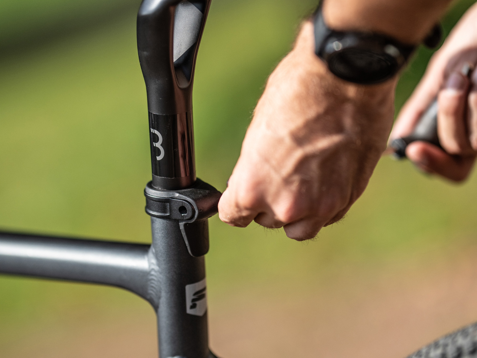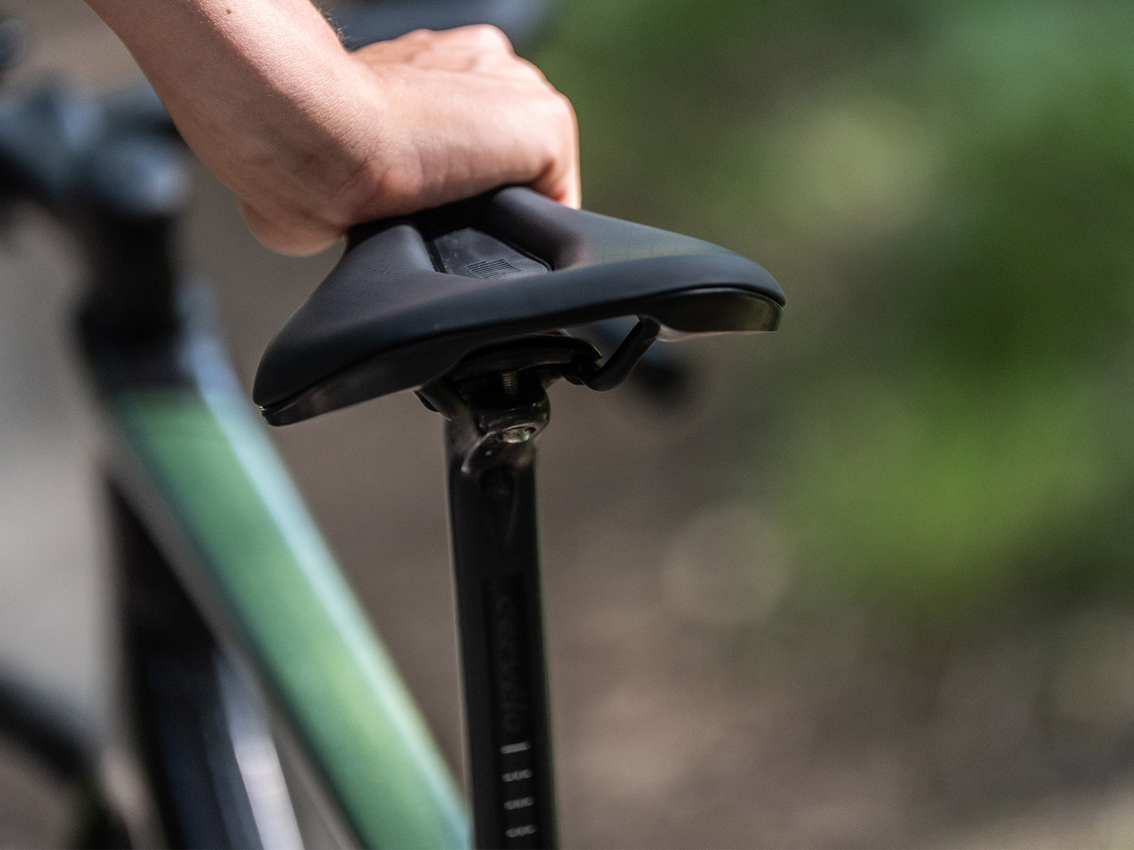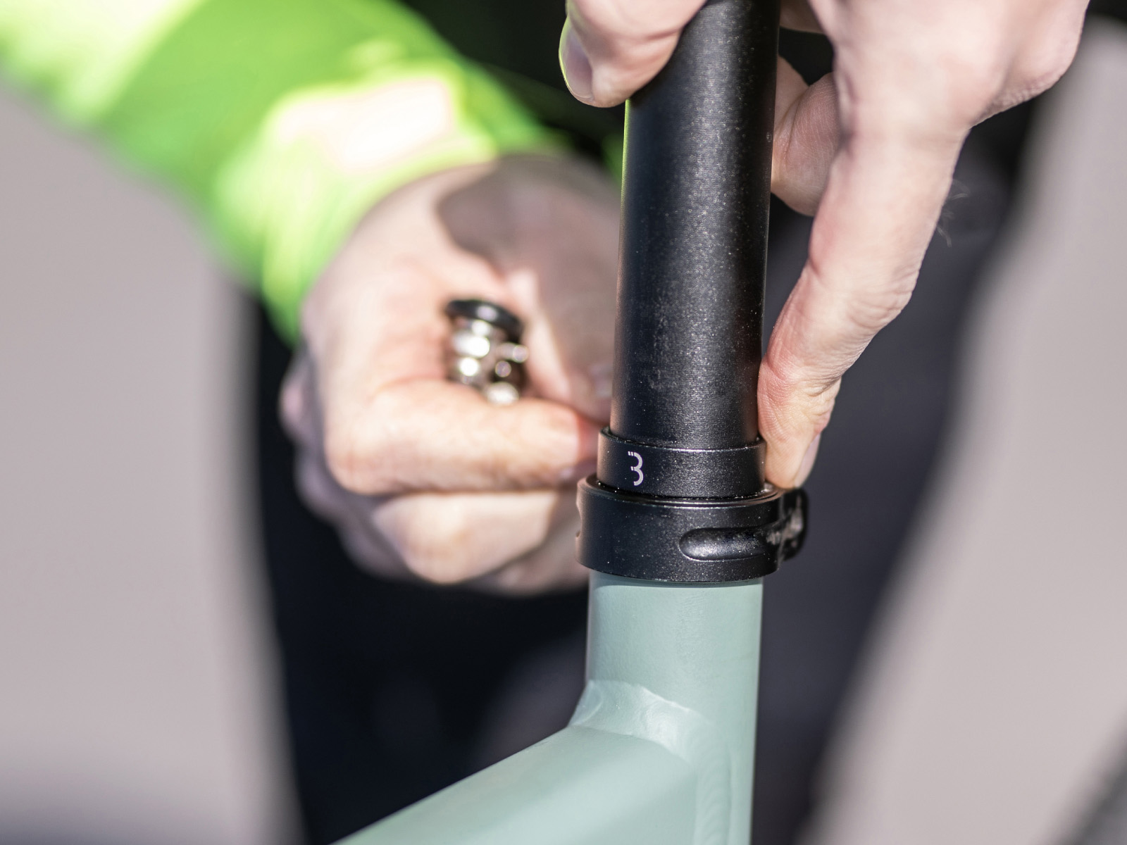 When you have found the right height, tighten the seatpost clamp. Make sure the saddle is perfectly straight according to the bike frame. Don't tighten the seatpost clamp too tightly. Often, the right torque (Nm) is written on the seatpost, bike frame, or seatpost clamp. If the seat post slowly starts to come down over a period of time, even though you have used the right torque, the PostFix might be a solution. This ring prevents your seatpost from coming down. After the seatpost is mounted, you can go back to your saddle and adjust the position for the exact right position for you!