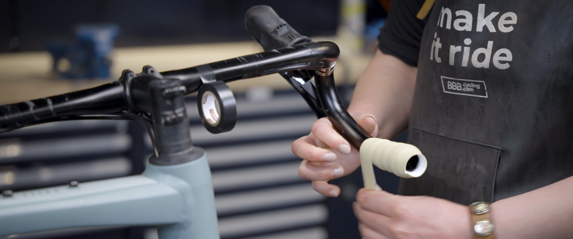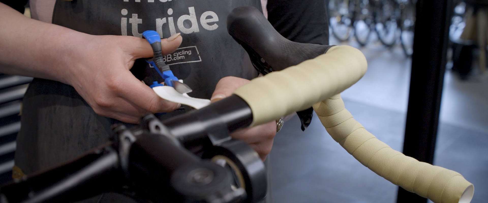 Het einde van je stuurlint knip je in de lengterichting diagonaal af met een schaar. Hierdoor is de laatste wikkeling van je stuurlint volledig recht (haaks op het stuur). Plak vervolgens de uiteinde van het stuurlint vast met de meegeleverde stukje tape, of gebruik isolatie tape.