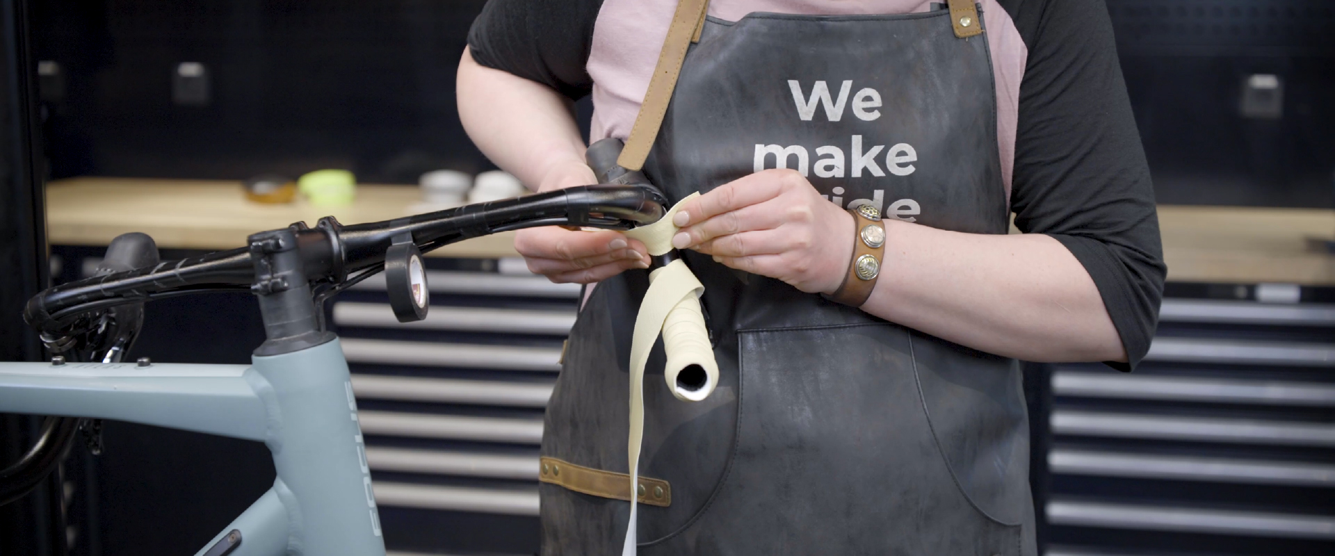 Houdt de twee bijgeleverde losse stukjes stuurlint even apart, deze heb je straks nodig. Begin met het wikkelen van je stuurlint aan de linkerkant van je stuur, aan het uiteinde (waar je stuurdop in je stuur zit). Vanuit hier wikkel je rechtsom (met de klok mee) en je zorgt ervoor dat het stuurlint steeds de vorige slag half overlapt. Aan de rechterkant begin je hetzelfde maar draai je precies in tegenovergestelde richting (tegen de klok in). Trek het stuurlint tijdens het wikkelen goed strak voor een nette afwerking.