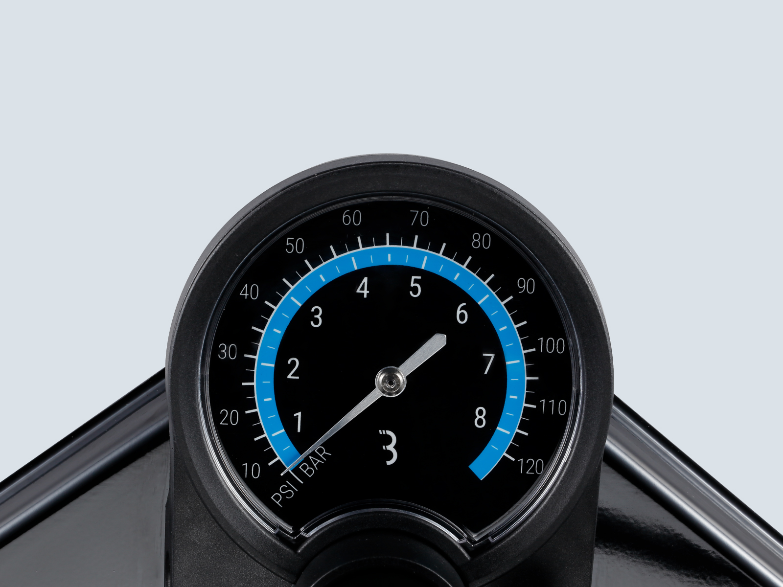 Discover the AirSmart, a new generation in floor pumps. A high-quality floor pump with an easy-to-read pressure gauge which ensures precision in every movement. The ergonomic handle allows powerful pumping in a natural position, complemented by a 120cm high-pressure rubber hose and premium pump head for optimal efficiency. With its steel barrel and foot the AirSmart provides extra stability. A brother of the BFP-41 AirSwitch, it shares the same design and quality, making it an ideal choice for those seeking performance and style.