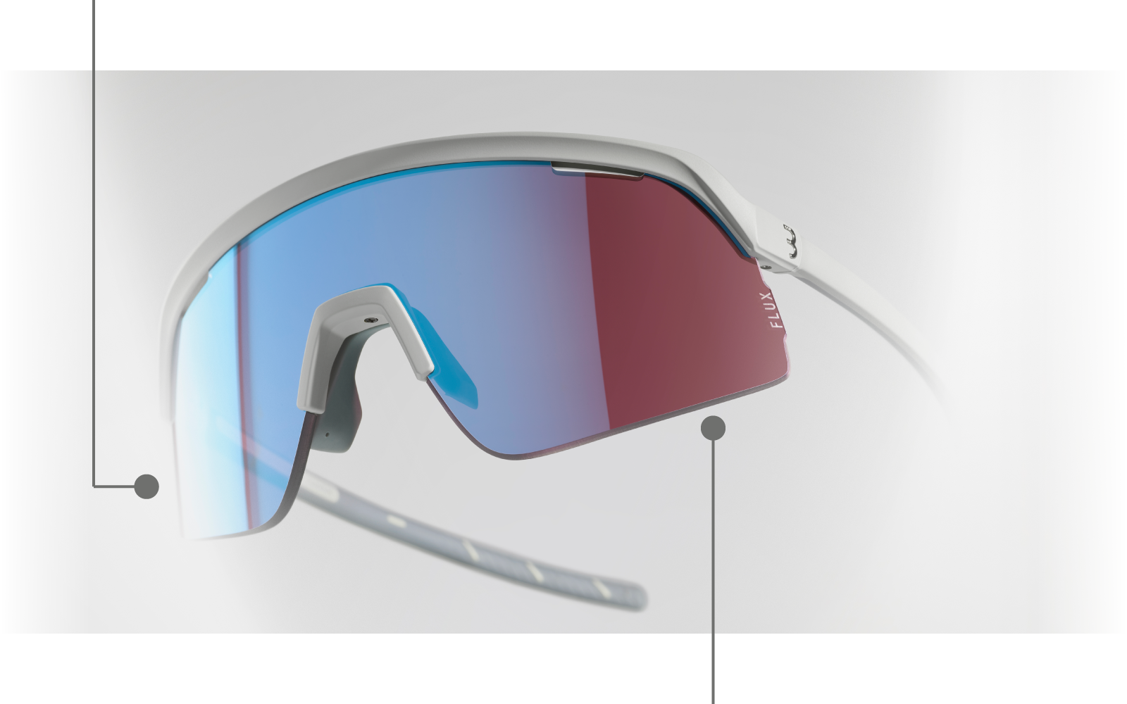 The adjustable nose piece of the new Valor, made from a flexible metal strip with a rubber coating, ensures a perfect fit of the FLUX lens. By gently pressing on both sides, you can effortlessly customise the fit to match the width of your nose. This feature ensures that your cycling glasses sit tight and securely on your head. So you don't have to worry about losing your glasses during your rides.